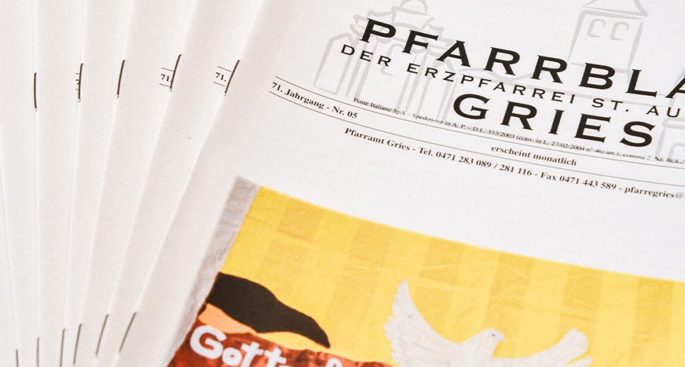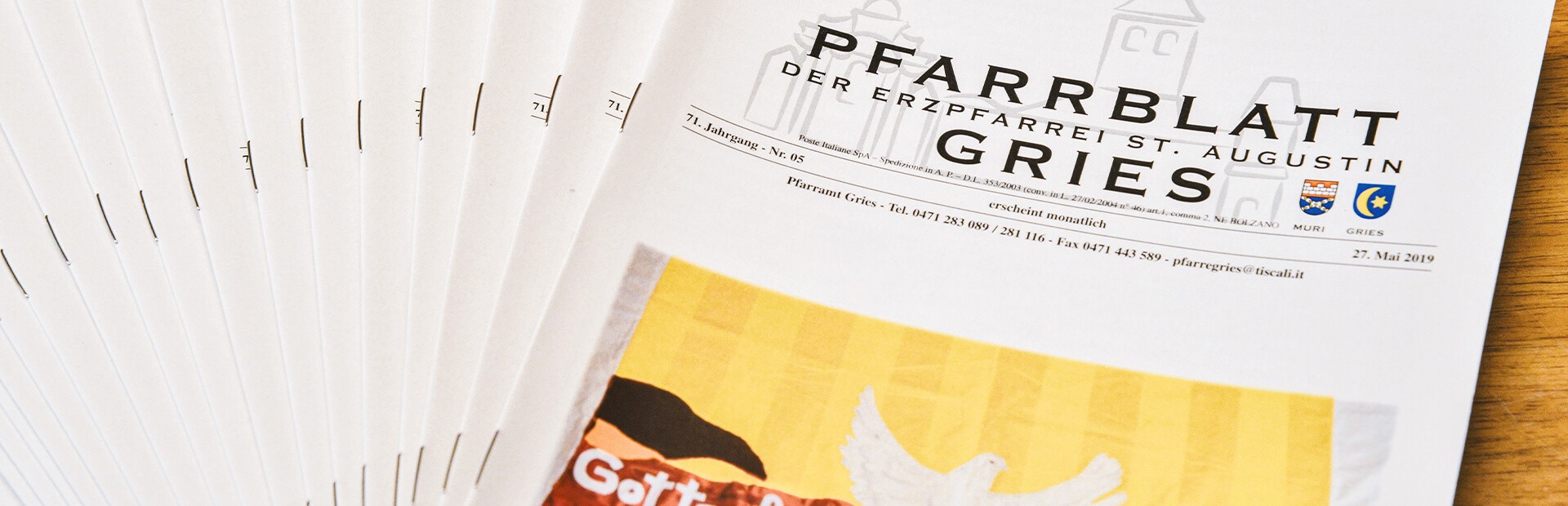 Das Pfarrblatt erscheint im Vier-Wochen-Rhythmus und liegt auch in den Kirchen in Gries zum Mitnehmen auf. Alle Angaben zu Veröffentlichung und Redaktionsschluss stehen dir ebenfalls als Download zur Verfügung.