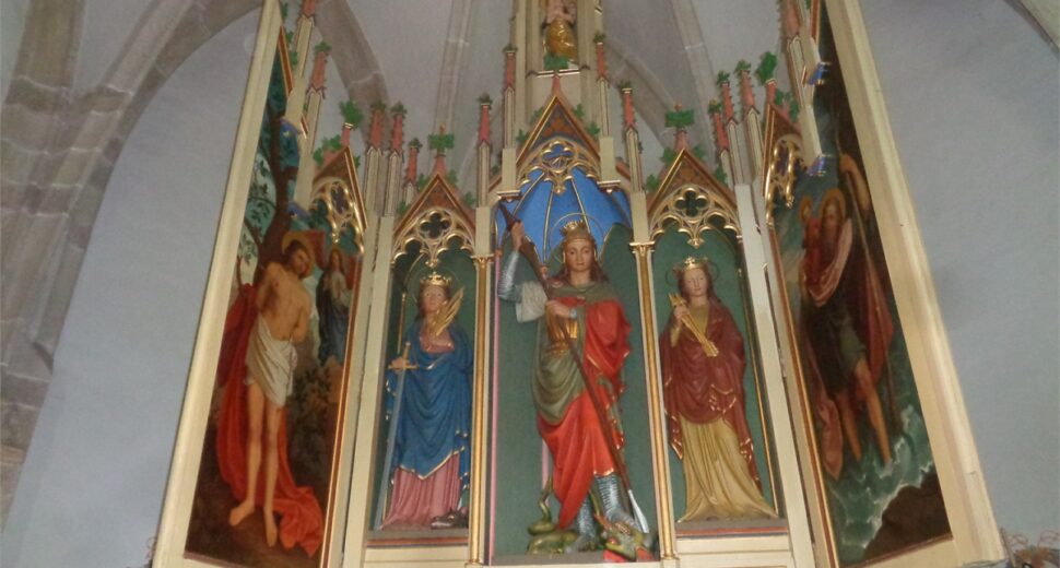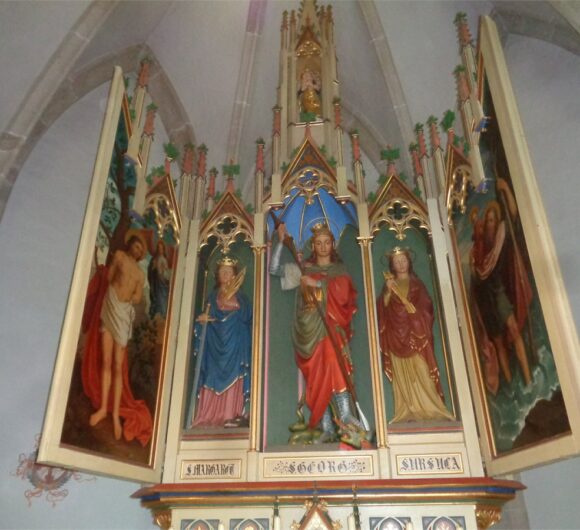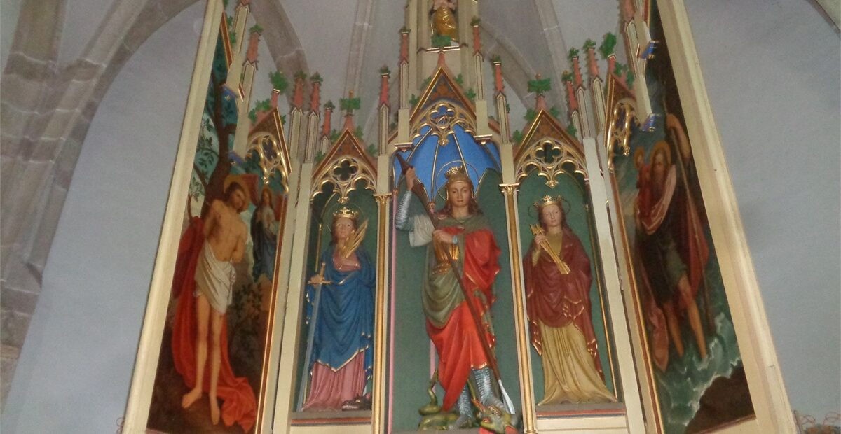 Der neugotische Flügelaltar (19. Jh.) mit dem hl. Georg, flankiert von der hl. Margareth und der hl. Ursula von Alois Winkler, Innsbruck wurde nach einer Zeichnung des Malers Albrecht Steiner von Felsburg (1838-1905) hergestellt. Im Aufsatz findet sich eine spätgotische Holzstatue Maria mit Kind (1. Hälfte des 16. Jh.).