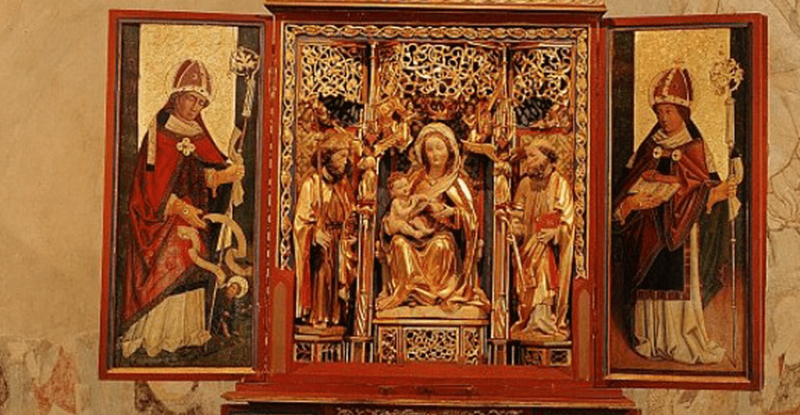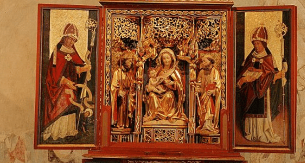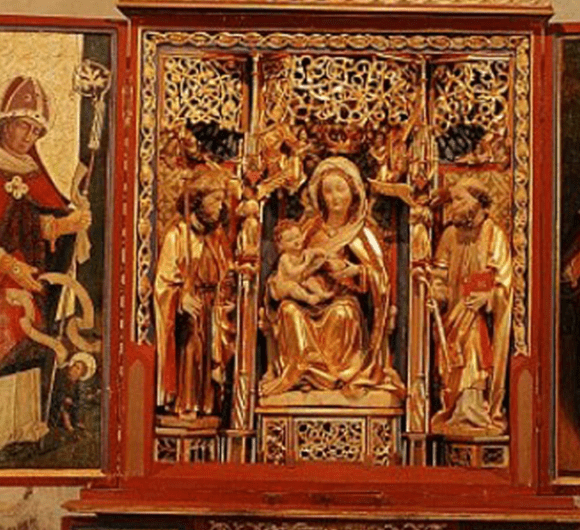 Im spätgotischen Flügelaltar, ein Werk des Bozner Meisters Ende des 15. Jhdt., ist Maria mit Kind dargestellt, das eine Birne in der Hand hält, flankiert von den Aposteln Jakobus und Petrus. Weiters abgebildet sind die heiligen Barbara, Christina und Magdalena sowie die heiligen Augustinus, Vigilius, Martin mit Bettler, Matthias mit Buch und Beil sowie Georg, Oswald und die hl. Ärzte Kosmas und Damian.