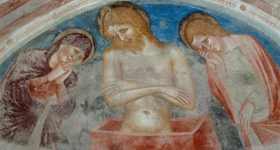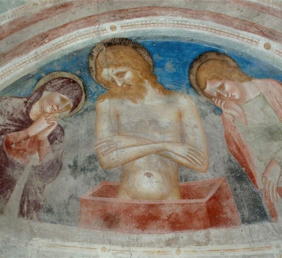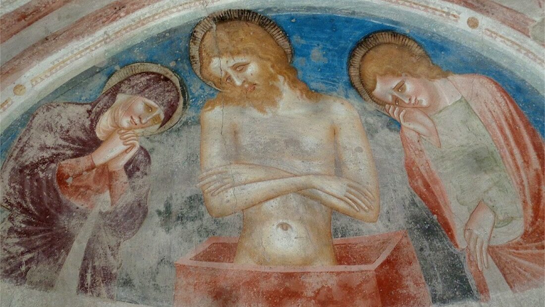 Aus der Mitte des 14. Jh. stammen die Fresken in der romanischen Apsis und im ehemaligen Langhaus, das von der Sakristei aus zugänglich ist.